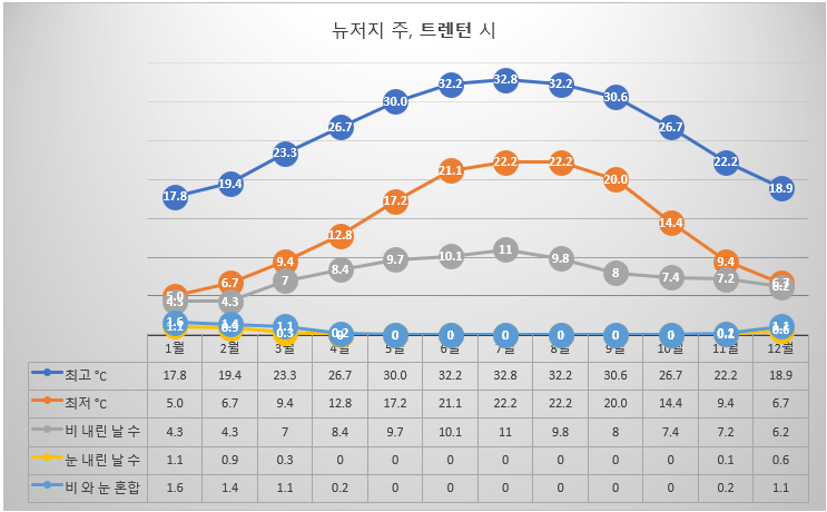 뉴저지는 뚜렷한 사계절이 있고 지리적, 환경적, 대기적 요인에 의한 기상 패턴의 특성이 또한 명확하다. 주 전체는 습한 아열대 기후대에 속하고 대륙성 기후와 해양성 기후가 혼합되어 있다. 뉴저지 해안지역은 대서양과 가깝기 때문에 해양의 온화한 영향을 받아 내륙 지역에 비해 여름 동안은 시원하고 겨울은 비교적 따뜻한 편이다. 해안 지역의 여름 낮 평균 기온은 27°C에서30°C 가량이고, 저녁 평균 기온은 20°C 에서 24°C 정도이다. 해안 지역의 겨울 낮 평균 기온은 3°C 에서 7°C 가량이고, 저녁 평균 기온은 영하 4°C 에서 2°C 정도이다. 뉴저지 위도 상의 위치는 뉴저지 내륙지역의 여름을 더 덥고, 겨울을 더 춥게 만든다. 여름 낮 평균 기온은 29°C 에서 35°C 가량이고, 밤 평균 기온은 20°C 에서 24°C 정도이다. 겨울 낮 평균 기온은 3°C 에서 7°C 가량이고, 밤 평균 기온은 영하 9°C 에서 영하 4°C 정도로 대서양의 온도조절 영향에서 멀리 떨어져 있어 추운 겨울이다. 애팔래치아 산맥을 포함한 뉴저지의 북서부 고원지역은 고도가 높아 시원한 여름 기온이 유지되는데, 고지대 여름 낮 평균기온은 25°C 에서 28°C 가량이고, 밤 평균 기온은 상쾌하여 14°C 에서 16°C 정도이다. 고지대의 겨울은 뉴저지 주에서 가장 추운 곳으로 낮 평균 기온은 2°C 에서 6°C 가량이고, 밤 평균 기온은 영하 6°C 에서 2°C 정도이나 한파가 몰려오면 영하 12°C 아래도 떨어지는 경우도 허다하다. 이 기간 동안 고지대에 강설량이 높아 겨울 스포츠 매니아들에게 인기가 높다. 뉴저지의 따뜻한 계절에는 뇌우 발생이 빈번하여 홍수와 정전이 발생하기도 하고, 6월부터 11월 동안에는 대서양 허리케인 시즌으로 강한 바람, 폭우, 해안 침식이 발생하기도 한다. 가을과 겨울에 빈번히 발생하는 북동풍은 폭우, 눈, 강풍을 동반한 해안 폭풍으로 해안 홍수 발생시킨다. 겨울 폭풍은 눈과 얼음을 동반하여 학교 폐쇄, 교통 정체 등을 발생시킨다. 최근 몇 년 동안 뉴저지주도 다른 많은 주와 마찬가지로 기후 변화의 영향으로 허리케인, 폭우 등 심각한 기상 이변이 더욱 빈번해지고 있다. 변덕스러운 날씨와 기상 이변에 대비하는 지혜가 필요하다. 국립 기상청의 일기예보, 경고 및 날씨 관련 정보를 통해 필수 물품을 준비하고, 미처 예측되지 못한 산발적인 상황을 대비하여 대피 경로와 장소를 미리 알아두거나 필수 물품을 마련해 두는 것도 좋은 방법이다.