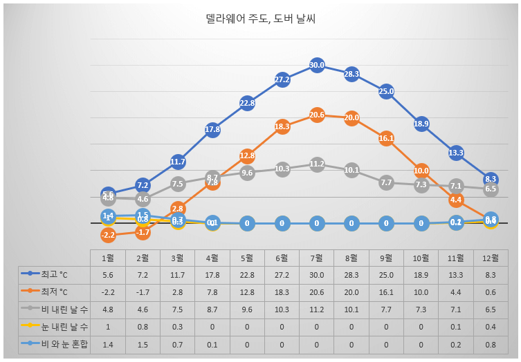 델라웨어는 사계절이 뚜렷합니다. 봄에는 10°C~21°C의 온화한 기온이 유지되는 시기입니다. 델라웨어 보타닉 가든을 둘러보고 새 순이 돋아나고, 꽃이 피어나기 시작하는 자연의 생명력을 목격할 수 있는 계절입니다. 여름은 따뜻하고 쾌적하며 기온은 24°C~29°C 정도입니다. 시원한 바닷바람이 여름의 더위를 식혀주는 레호보스 비치와 베다니 비치와 같은 주 내 청정 해변을 둘러보기에 이상적인 시기입니다. 가을이 시작되면 주변의 여러 공원과 산책로를 따라 걸으며 형형색색으로 변하는 풍경을 감상하기에 너무도 좋은 시기 입니다. 기온은 10°C ~21°C입니다. 겨울에는 -1°C ~7°C의 쌀쌀한 기온이 지속되며, 가끔 눈이 내리기도 합니다. 델라웨어의 겨울 원더랜드는 윌밍턴 리버프론트에서 아이스 스케이트를 타거나 롱우드 가든에서 홀리데이 조명을 즐기는 등 야외 활동을 마음껏 즐기기에 너무도 안성맞춤인 장소입니다.