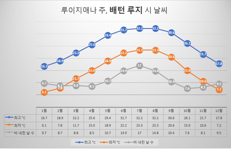 루이지애나는 일반적으로 습한 아열대 기후이나 멕시코 만과의 근접성, 지리와 고도의 변화로 주 전역에 뚜렷한 기후대의 특징과 계절의 차이가 있다. 먼저 해안 지역은 습한 아열대 기후로 덥고 습한 여름과 온화한 겨울이 특징이다. 뉴올리언스, 배턴루지, 후마 등의 도시와 루이지애나 최남단 지역이 포함된다. 여름 평균 최고 기온이 29°C에서 35°C 정도 된다. 습도가 아주 높아 더 덥게 느껴지기도 한다. 뇌우 발생이 잦아 더위를 식혀지기도 하나 홍수의 위험이 따른다. 해안 지역의 겨울은 상대적으로 온화하여 낮 기온은 보통 10°C에서 20°C 정도 된다. 눈이 내리는 경우는 드무나 가끔 한랭 전선으로 인해 쌀쌀한 기온이 느껴지기도 한다. 중앙 지역은 습한 아열대 기후로 라피엣, 알렉산드리아, 레이크찰스 등의 도시를 포함해 루이지애나의 중심부를 포함한다. 해안 지역과 북부 지역의 요소가 혼합된 기후가 나타난다. 중부 지역의 여름은 덥고 습하며 기온이 32°C를 넘는 경우가 많고 뇌우가 자주 발생한다. 중부 지역의 겨울은 해안 지역보다 춥지만 북부 지역보다는 온화하며, 평균 주간 기온 10°C에서 20°C정도이다. 눈이 내리는 경우는 별로 없으나 한랭 전선의 영향으로 기온이 더 낮아지고 바람이 강해지기도 한다. 북부 지역은 슈리브포트, 먼로, 러스턴 등의 도시를 포함하는 루이지애나 최북단 지역이다. 이 지역은 뚜렷한 계절 변화가 있는 습한 아열대 기후다. 북부 지역의 여름은 따뜻하고 습하며, 평균 기온은 27°C에서 35°C이다. 뇌우가 흔하게 발생하기도 한다. 북부 지역의 겨울은 해안지역이나 중앙 지역보다 시원하며 평균 주간 기온은 14°C에서 15°C를 유지한다.