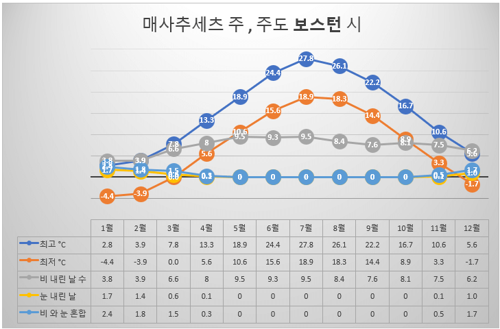 뚜렷한 4계절이 있는 매사추세츠 주는 서부 산악지대, 내륙지대, 동부 해안지대의 3개 기후대로 또한 구분할 수 있다. 구릉 지대와 버크셔 산맥과 근접한 서부 매사추세츠는 높은 고도 덕분에 추운 겨울과 시원한 여름이 특징이다. 보스턴, 케임브리지, 퀸시 등 주요 도시가 있는 동부 매사추세츠는 해양성 기후로 겨울은 춥지만 대서양과 근접하다는 지리적 특징으로 온도가 조절되어 여름에는 시원하다. 3월의 봄은 서부 지역의 평균 기온은 해안을 따라 0°C에서 4°C로 비교적 쌀쌀하게 느껴진다. 5월 서부 평균 최고 기온은 18°C, 동부 지역 평균 최고 기온은 15°C로 따뜻하다. 6월부터 8월의 여름은 대체로 맑은 날씨로 평균 고온은 서부 지역 24°C, 해안을 따라 27°C까지로 온도차이의 폭이 넓은 편이다. 때로 여름철 폭염으로 장기간 기온이 32°C를 초과하기도 하나, 9월부터 기온이 떨어지기 시작한다. 9월의 평균기온은 18°C에서 10°C정도이다. 12월부터 2월 겨울 동안 내륙과 산악 지역은 많이 추우나, 상대적으로 해안 지역의 겨울은 온화하다. 12월 평균 서부 최고 기온은 약 4°C, 동부 지역은 7°C정도이다. 1월과 2월 동안에는 평균 최고 기온이 -1°C 이하로 크게 떨어지고 서부와 중부 지역에서 눈이 자주 내리기 때문에 겨울 스포츠를 좋아하는 사람들에게 인기 있는 장소이다. 주의 할 것은 노리스터라고 불리는 강력한 겨울폭풍 발생이 빈번하여 혹설, 강풍 및 해안 범람이 발생할 수 있어 이에 대한 대비가 필요하다.