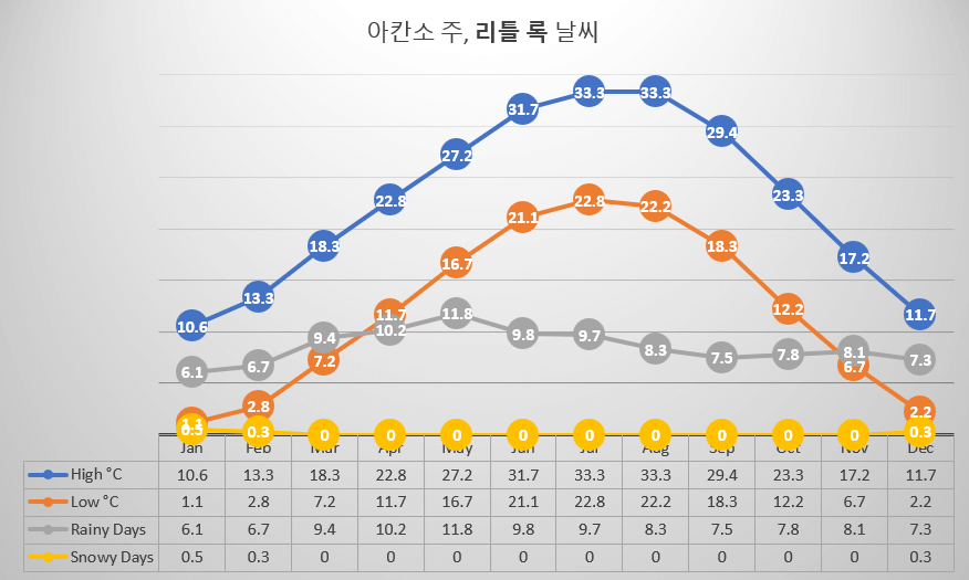 미국 중남부에 위치한 아칸소는 대부분 지역의 습도가 높고 여름은 덥다. 주의 지리와 지형에 따라 주요 3개의 기후대로 분류할 수 있다. 북쪽에 위치한 오자크 하이랜드 기후대는 험준하고 언덕이 많은 지형이 특징으로 언덕, 고원, 깊은 계곡이 곳곳에 있다. 뚜렷한 계절을 지닌 온대 기후로 여름은 따뜻하여 야외 활동에 큰 불편함이 없다. 겨울에 가끔 기온이 영하로 내려가고 눈이 내리기도 하지만 강추위는 아니다. 봄 평균 기온은 약 10°C에서 25°C, 여름은 약 21°C에서 32°C, 가을은 약 10°C 에서 23°C, 그리고 겨울은 약 영하 1°C 에서 10°C 정도된다. 아칸소 주 서쪽에 위치한 와시타 산맥 기후대는 따뜻한 여름, 온화한 겨울, 적당한 강수량이 특징인 아열대 기후이다. 계절 간 온도의 차이가 크지 않아 일 년 내내 활동에 큰 제약을 받지 않는다. 봄 평균 기온은 약 10°C 에서 24°C, 여름은 약 20°C 에서 32°C, 가을은 약 10°C 에서 에서 24°C, 그리고 겨울은 약 1°C 에서 12°C 정도 된다. 주도인 리틀 록은 외시타 산맥 기슭에 인접해 있다. 대부분의 남부 지역에 펼쳐진 걸프 해안 평원의 지형은 다양하여 평평한 지형, 구불구불한 지형, 일부지역에서는 고도의 기복이 있기도 하다. 걸프 해안 평원은 습한 아열대 기후로 아칸소에서 가장 더운 지역이다. 여름은 습하고 더우며 겨울은 온화하다. 걸프 해안 평원 기후대의 봄 평균 기온은 약 15°C 에서 18°C, 여름은 약 27°C 에서 38°C, 가을은 약 16°C 에서 28°C, 그리고 겨울은 약 4°C 에서 16°C 정도 된다.