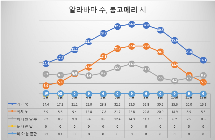 미국 남동부 지역에 위치한 알라바마는 뚜렷한 사계절이 있고, 겨울은 온화하고 여름은 덥다. 알라바마의 지리적 특징도 날씨 패턴을 형성하는 데 큰 영향을 미친다. 지리적 특징은 해안 평야, 피드몬트 고원, 애팔래치아 고원의 세 가지 주요 지역으로 구분된다. 남부에 위치한 해안 평원은 멕시코만과의 근접성에 큰 영향을 받아 습한 아열대 기후가 특징이다. 높은 습도, 더운 여름, 일 년 내내 강수량이 상당히 높고, 북부 지역에 비해 겨울은 따뜻한 편이다. 주의 중앙 부분을 덮고 있는 피드몬트 고원의 고도 변화는 이 지역 온도 변화에 영향을 준다. 겨울은 해안 평원보다 시원하고 여름은 일반적으로 온화하다. 알라바마의 최북단인 애팔래치아 고원은 기후는 겨울엔 더 춥고 여름은 남부 지역에 비해 약간 시원한 편이다. 평균 기온은 여름에는 종종 최고 기온이 32~35°C가량이 유지되고, 겨울에는 4~15°C사이로 온화하여 지독한 겨울철 냉기를 피할 수 있는 이상적인 거주지 중의 한 곳이다. 봄과 가을은 15~20°C에서 20~25°C 사이의 쾌적한 기온이 유지되어 야외 활동을 즐기기 좋은 날씨다. 알라바마는 때때로 열대성 폭풍과 토네이도가 발생하는 등 악천후가 발생하기는 하나 이러한 상황이 발생해도 안전하게 지낼 수 있도록 지역사회가 대비하고 있다. 봄의 온화한 따뜻함, 여름의 간헐적인 뇌우, 가을의 화려한 단풍, 겨울의 포근한 기온이 알라바마 날씨의 특징이다.