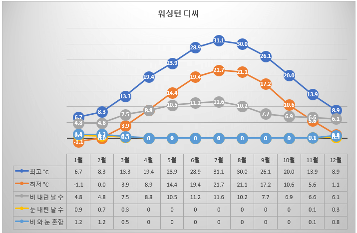 워싱턴 디씨는 습한 아열대 기후로 뚜렷한 사계절이 특징이다. 봄과 가을 동안은 평균 기온이 14°C-24°C으로 쾌적한 기온이 유지된다. 여름은 최고 29-34°C, 최저 15-25°C의 기온이다. 워싱턴 디씨의 여름은 따뜻한 기온뿐만 아니라 습도도 높다. 열과 습도의 조합으로 인해 느껴지는 무더위 동안에는 수분을 유지하고 폭염에 대비해 예방 조치를 취하는 지혜는 필수이다. 겨울은 평균 영하 6°C에서 영하 1°C까지 떨어지기 때문에 쌀쌀한 기온이다. 미국의 중부 대서양 지역에 위치하고 있는 워싱턴 디씨는 대서양, 애팔래치아 산맥, 체서피크만 등의 영향을 받는다. 대서양과의 근접성은 극심한 온도 변화를 완화시켜 도시의 기후에 온화하게 만든다. 도시를 가로질러 흐르는 포토맥 강도 기온에 중요한 영향을 준다. 강은 온도를 조절하여 따뜻한 날씨와 추운 날씨 모두에 영향을 미치는 습도의 원천이 된다. 콘크리트와 아스팔트 표면으로 이루어진 도시는 도시 열섬효과를 만든다. 이 현상은 시골 환경에 비해 도시 내에서 더 높은 온도가 유지되고 특히 여름철에 두드러진다. 워싱턴 디씨는 최고 기온이 41°C까지 올랐던 기록이 있다. 빈번한 폭우의 증가와 지속되는 폭염을 포함하여 날씨 패턴의 변화를 인식한 워싱턴은 강화된 빗물 관리 시스템 및 에너지 효율성을 촉진하기 위한 새로운 구상 등 기초적인 시설 개선에 많은 투자를 하고 있다.