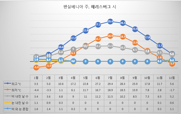 펜실베니아의 기후는 뚜렷한 사계절이 독특하게 혼합되어 있는데 위도, 고도, 수역과의 근접성, 지리적 특징의 영향을 받고 있기 때문이다. 넓은 면적 내에는 산, 고원, 계곡, 해안 평야가 포함되어 있고, 동쪽으로는 대서양과 접해 있다. 펜실베니아 지역을 크게 세 가지 지역으로 나눌 수 있는데 첫 번째가 남동부 펜실베니아이다. 이 지역은 필라델피아와 같은 도시를 포함한 습한 아열대 기후로 여름은 일반적으로 따뜻하고 습하며, 겨울은 상대적으로 온화하며 가끔 눈이 내린다. 두 번째 지역은 남서부 펜실베니아 지역으로 피츠버그를 포함한 이 지역은 습한 대륙성 기후로, 여름은 따뜻하고 겨울은 추운 특징이 있다. 세 번째로 펜실베니아 북부 및 중부의 광대한 지역은 주로 산악지대이며 습한 대륙성 기후 또는 아북극성 기후를 나타낸다. 겨울은 춥고 눈이 많이 내리는 반면, 여름은 비교적 온화한 편이다. 펜실베니아의 봄은 3월부터 5월까지로 최고 기온은 10°C에서 21°C가량이나 이른 봄에는 밤에 서리가 내리면서 기온이 낮아지기도 한다. 습도가 굉장히 높은 편으로 북부와 산악 지역에서는 시즌 초반에 약간의 눈이 내리기도 한다. 펜실베니아의 많은 주립 공원에서 피크닉이나, 가벼운 산책, 하이킹, 자전거 타기에 좋은 계절이다. 여름은 일반적으로 6월부터 8월까지로 주간 최고 기온은 24°C에서 29°C 정도이다. 가끔 천둥번개가 치고 습도는 특히 남동부 지역에서 높다. 수상 스포츠를 즐기거나, 캠핑을 가기에 좋은 시기이다. 일반적인 가을시기와 마찬가지로 팬실베니아의 가을도 보통 9월부터 11월까지인데 단풍이 아름답기로 유명하다. 낮 최고 기온은 13°C에서 21°C 가량이며, 밤에는 상당히 추워지기도 한다. 현지 농장이나 과수원을 방문하여 사과와 호박을 직접 수확하거나 신선한 사과주스와 사과도넛을 맛볼 수 있는 시기이다. 겨울은 일반적으로 12월부터 2월까지로 눈 덮인 풍경과 다양한 겨울 스포츠가 충분히 가능한 계절이다. 낮 최고 기온은 -1°C에서 4°C 정도이나 밤은 훨씬 더 춥고 영하로 기온이 내려가는 경우가 빈번하다. 북부와 서부 지역에 특히 눈이 자주 내려 스키, 스노보드, 아이스 스케이팅과 같은 겨울 스포츠를 즐기기에 충분한 조건을 만든다. 포코노 산맥과 로렐 하이랜드에 스키 리조트들이 많이 있다. 펜실베니아도 지난 몇 년간 강한 폭풍우, 기온 상승, 강수량 변화 등 기후 변화의 영향을 많이 받고 있다.
