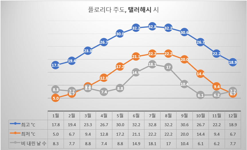 플로리다는 북회귀선 근처에 위치하여 특히 남부 지역에서 열대성 기후가 두드러진다. 삼면이 바다로 둘러싸인 플로리다는 대서양과 멕시코 만의 영향으로 내륙에 비해 온화한 기온이 유지된다. 팬의 손잡이 모양처럼 생겨 이름이 팬핸들이라고 불려지는 지역과 잭슨빌 같은 북부 지역은 남부보다 사계절의 차이가 뚜렷하며, 남부보다 겨울 기온이 낮고 가끔 서리가 내린다. 올랜도와 템파가 위치한 중부 지역은 우기와 건기가 뚜렷한 아열대 기후의 특징이 있다. 여름에 덥고, 겨울은 포근하다. 웨스트 팜비치, 마이애미 같은 남부 지역은 일 년 내내 따뜻한 기온이 지속되는데 겨울에도 따뜻하고, 여름은 아주 덥다. 플로리다의 봄과 가을 평균 기온은 섭씨 21도에서 27도 가량`되고, 여름 평균 기온은 섭씨 35도에서 37도가량으로. 겨울 평균 기온은 12도에서 24도가량으로 추운 겨울을 싫어하는 사람들이 살기에 아주 좋은 날씨이다. 6월부터 11월까지 발생하는 대서양 허리케인 시즌은 주목할 만한 플로리다의 기상현상이다. 열대 폭풍으로 인한 폭우와 돌풍에도 취약해 플로리다 여러 지역이 영향을 받는다. 안전을 위한 고급 경고 시스템과 대비 조치가 마련되어 있으나, 이 기간 동안에는 일기예보에 특히 주의를 기울여 자연재해를 대비한 준비와 대피 계획이 필요하다. 대 도시 중의 하나인 마이애미에서는 밀집된 건물과 아스팔트 포장도로로 인해 밤늦게까지 고온이 유지되는 도시 열섬 효과가 발생한다.