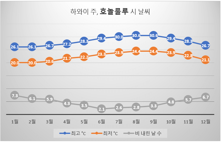 하와이는 일 년 내내 건기(카우)와 우기(후일로) 두 가지 주요 계절이 특징인 열대 기후로, 연간 평균 기온은 섭씨 24도에서 30도가량이다. 해안 지역은 일반적으로 더 따뜻하지만 빅 아일랜드와 같이 고도가 높은 곳은 시원한 편이다. 건기는 보통 5월부터 9월까지로 강우량은 적고 날씨가 전반적으로 따뜻하고 건조하다. 야외 활동과 해변으로 많은 인파가 몰리는 시기이다. 건기동안 평균 기온은 일반적으로 섭씨 24도에서 29도가량이다. 우기는 보통 10월부터 4월까지로 비가 더 많이 내려 흐른 날이 많고 가끔 폭풍이 몰아치는 경우도 있다. 그러나 우기에도 바람이 불어 가는 서쪽에서는 충분한 햇빛과 맑은 날씨가 유지되는 편이다. 우기동안 해안지역의 평균 기온은 섭씨 24도에서 29도 사이이나 야간 기온은 섭씨 18도에서 24도로 떨어질 수 있다. 고지대의 평균 기온은 섭씨 20도에서 24도가량이고, 야간 최저 기온은 섭씨 14도에서 20도로 내려갈 수 있다. 6월부터 11까지 이어지는 중앙 태평양의 허리케인 시즌에는 드물지만 가끔씩 열대성 폭풍과 허리케인의 영향을 받기도 한다. 하와이는 기상 현상에 대비하고 대응하기 위한 조치가 마련되어 있다.